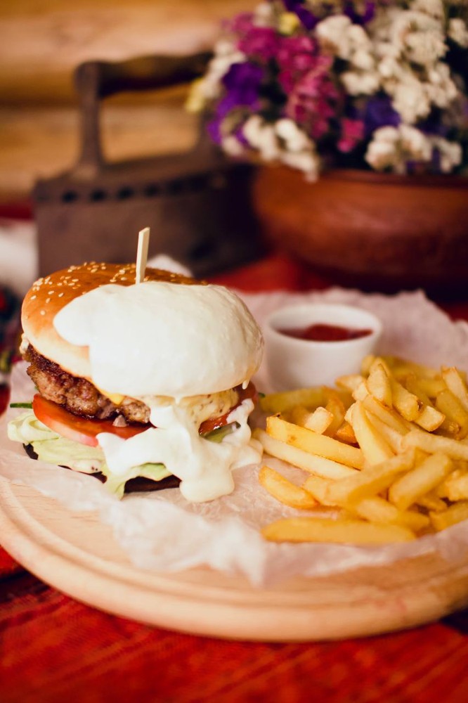 БУРГЕР ТЕЛЯТИНА СВИНИНА З КАРТОПЛЕЮ ФРІ І КЕТЧУПОМ